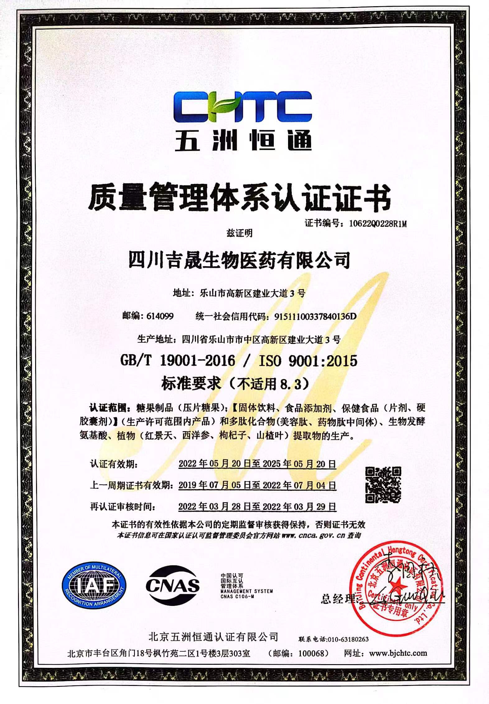 四川吉晟生物醫(yī)藥有限公司成立于2015年,位于四川樂山高新技術開發(fā)區(qū),工廠占地面積6萬多平方米,是一家集產品研發(fā)、生產、銷售為一體的國家高新技術企業(yè),通過了ISO9001、Kosher質量認證,2022年榮獲樂山市首家“瞪羚企業(yè)”。